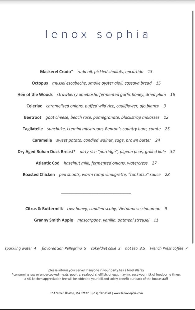 Introducing Lenox Sophia, a gem in Boston's Southie dining scene, offers a New American menu that delights the senses. Nestled at 87 A St, this 20-seat haven exudes a classy ambiance perfect for intimate dinners and celebratory gatherings. Reservations are welcomed, alongside convenient delivery and takeout options.